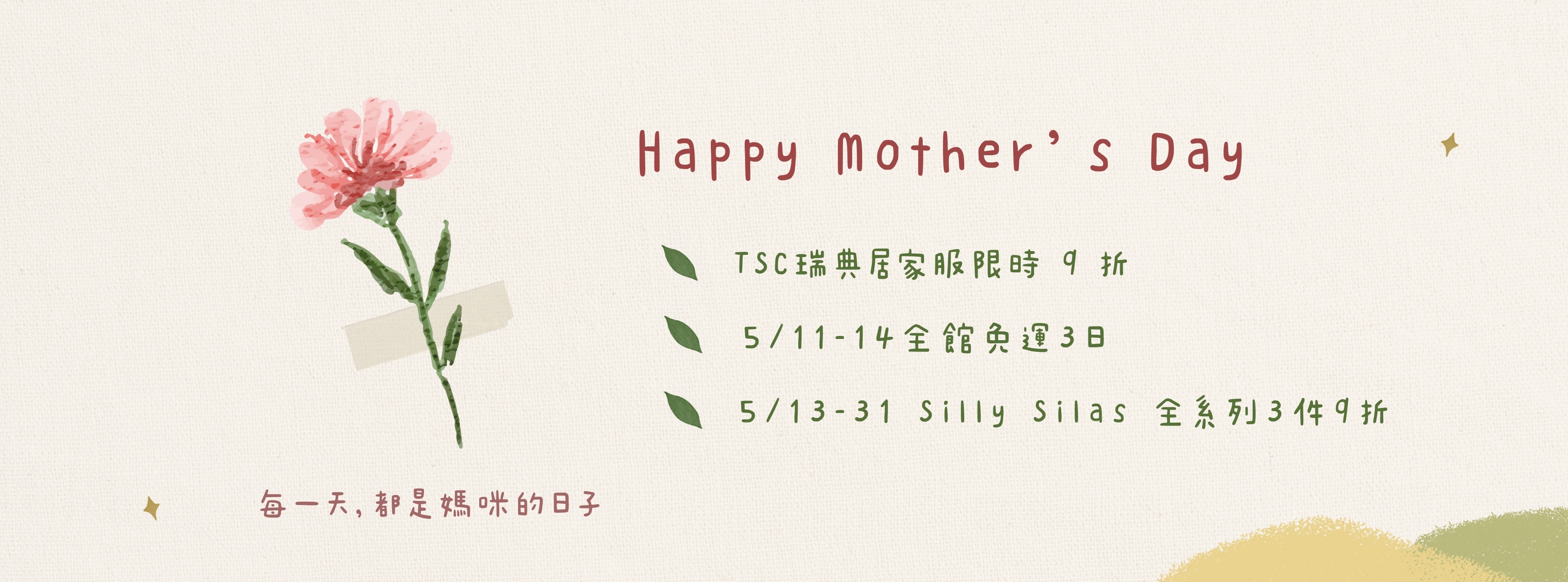 同步加碼推薦輕鬆育兒的四大品牌,把握 全館免運 和 Silly Silas 三件 9 折優惠 (5/13起),讓每個母親的一天比想像中更輕鬆,更能盡情享受與孩子度過的美好時光。