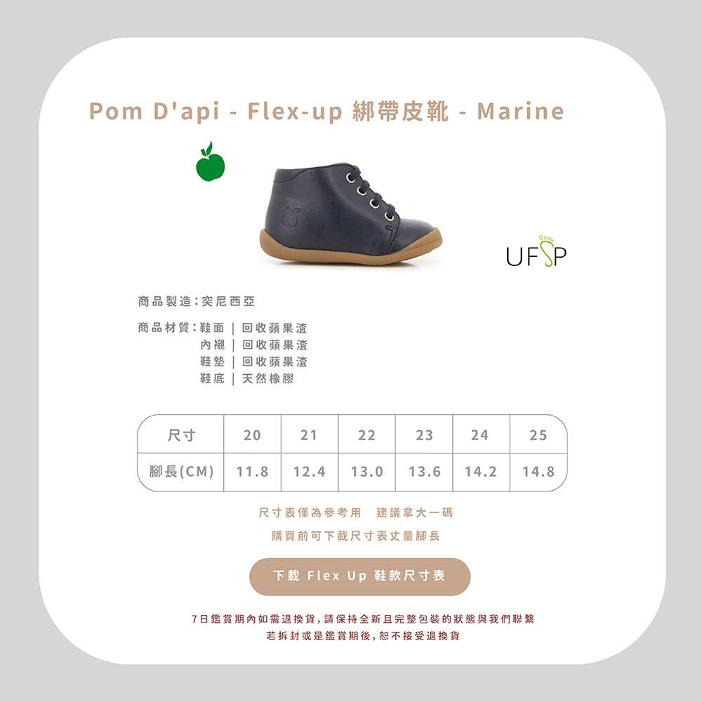 法國足醫專業指定,童鞋界中的愛馬仕精品!專精童鞋領域半個世紀以上的 Pom d’Api,致力成為專業學步鞋的領航者,與 UFSP 足科醫師聯盟合作,推出獨家「第一步鞋」系列,保證每雙鞋都具備科學要求兒童腳步發育的技術標準,支持孩童們邁出人生的第一步。從草圖到完成經過200多個工序,才呈現出細膩完美的質感,同樣重視環保的 Pom d’Api,還開發首創的再生皮革,更加柔軟透氣,也更加友善環境。  以法國著名童謠命名的 Pom d’Api,將法國人的優雅巧思融入精湛鞋藝,打造兼具實用與美感的可愛童鞋。自第一家精品店於1980年在巴黎市中心開業,便以卓越設計在這個時尚之都掀起流行風潮。  針對不同腳型研發的多款鞋型,提供百變的創意造型和經久不變的舒適耐用,在法國百貨歷久不衰的傳奇,穿過的人都知道!