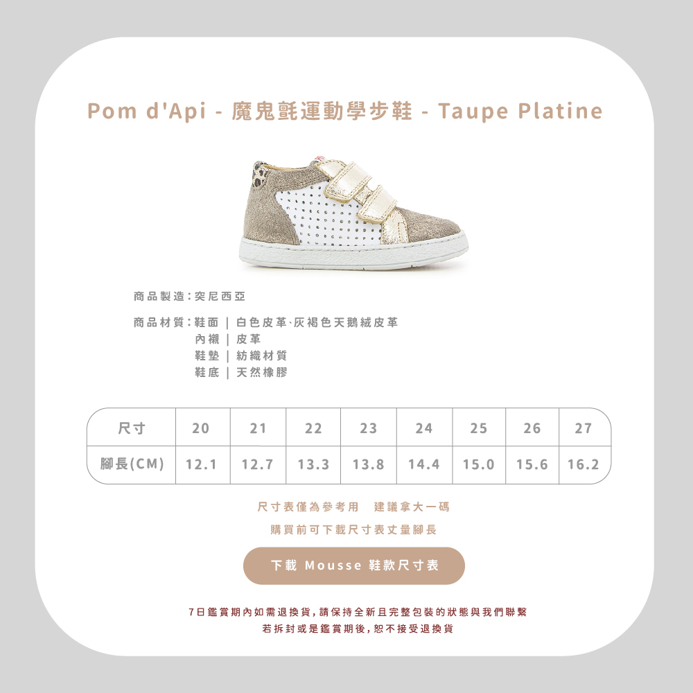 法國足醫專業指定,童鞋界中的愛馬仕精品!專精童鞋領域半個世紀以上的 Pom d’Api,致力成為專業學步鞋的領航者,與 UFSP 足科醫師聯盟合作,推出獨家「第一步鞋」系列,保證每雙鞋都具備科學要求兒童腳步發育的技術標準,支持孩童們邁出人生的第一步。從草圖到完成經過200多個工序,才呈現出細膩完美的質感,同樣重視環保的 Pom d’Api,還開發首創的再生皮革,更加柔軟透氣,也更加友善環境。  以法國著名童謠命名的 Pom d’Api,將法國人的優雅巧思融入精湛鞋藝,打造兼具實用與美感的可愛童鞋。自第一家精品店於1980年在巴黎市中心開業,便以卓越設計在這個時尚之都掀起流行風潮。  針對不同腳型研發的多款鞋型,提供百變的創意造型和經久不變的舒適耐用,在法國百貨歷久不衰的傳奇,穿過的人都知道!