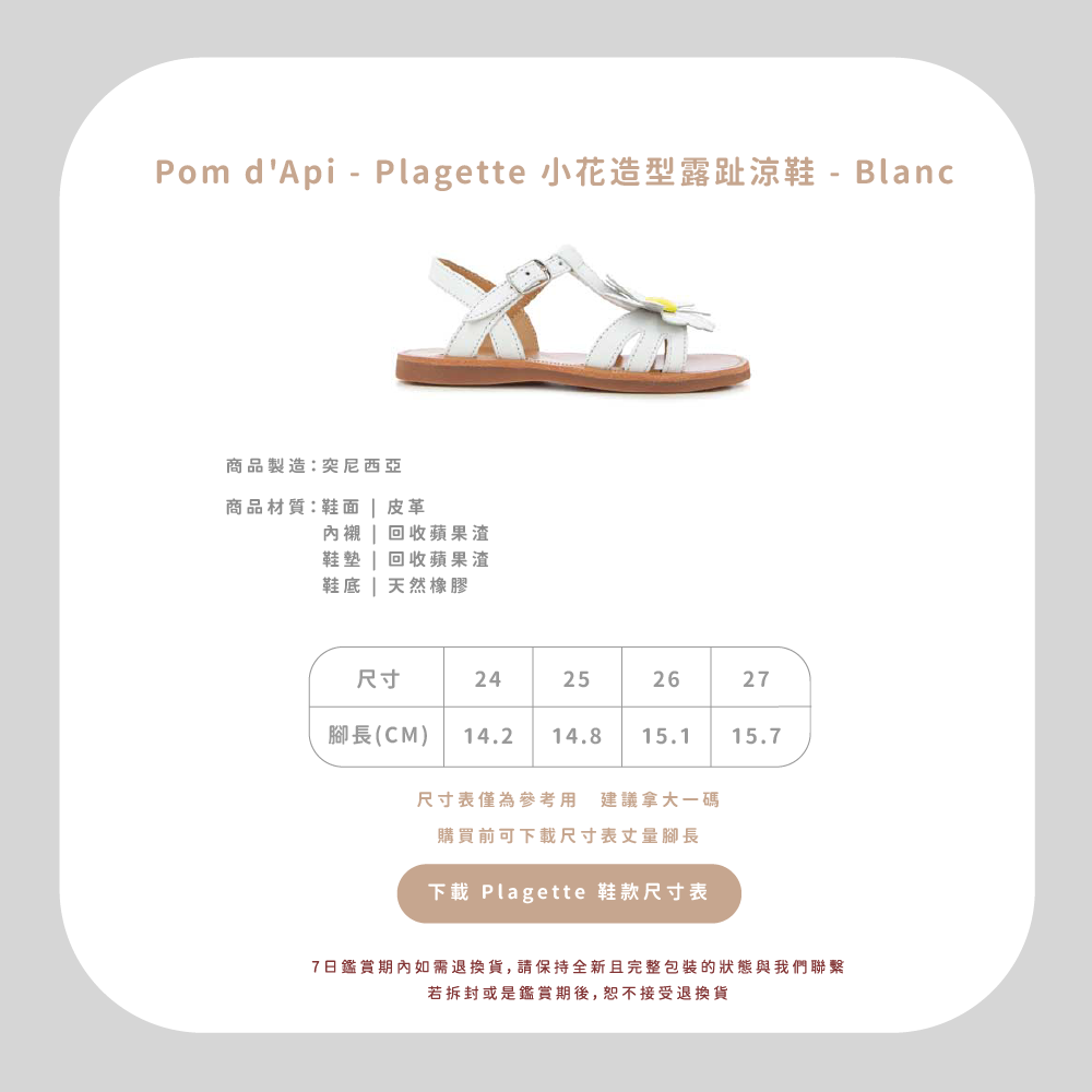 法國足醫專業指定,童鞋界中的愛馬仕精品!專精童鞋領域半個世紀以上的 Pom d’Api,致力成為專業學步鞋的領航者,與 UFSP 足科醫師聯盟合作,推出獨家「第一步鞋」系列,保證每雙鞋都具備科學要求兒童腳步發育的技術標準,支持孩童們邁出人生的第一步。從草圖到完成經過200多個工序,才呈現出細膩完美的質感,同樣重視環保的 Pom d’Api,還開發首創的再生皮革,更加柔軟透氣,也更加友善環境。  以法國著名童謠命名的 Pom d’Api,將法國人的優雅巧思融入精湛鞋藝,打造兼具實用與美感的可愛童鞋。自第一家精品店於1980年在巴黎市中心開業,便以卓越設計在這個時尚之都掀起流行風潮。  針對不同腳型研發的多款鞋型,提供百變的創意造型和經久不變的舒適耐用,在法國百貨歷久不衰的傳奇,穿過的人都知道!