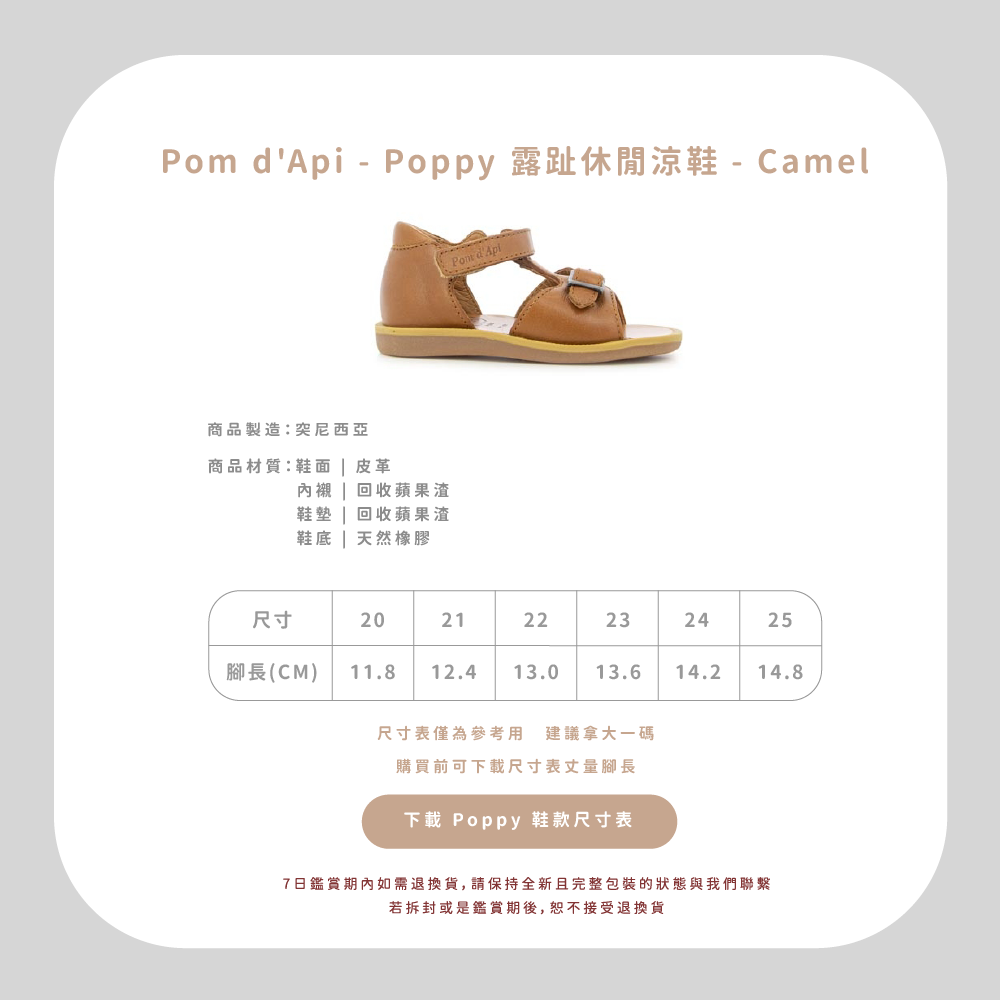 法國足醫專業指定,童鞋界中的愛馬仕精品!專精童鞋領域半個世紀以上的 Pom d’Api,致力成為專業學步鞋的領航者,與 UFSP 足科醫師聯盟合作,推出獨家「第一步鞋」系列,保證每雙鞋都具備科學要求兒童腳步發育的技術標準,支持孩童們邁出人生的第一步。從草圖到完成經過200多個工序,才呈現出細膩完美的質感,同樣重視環保的 Pom d’Api,還開發首創的再生皮革,更加柔軟透氣,也更加友善環境。  以法國著名童謠命名的 Pom d’Api,將法國人的優雅巧思融入精湛鞋藝,打造兼具實用與美感的可愛童鞋。自第一家精品店於1980年在巴黎市中心開業,便以卓越設計在這個時尚之都掀起流行風潮。  針對不同腳型研發的多款鞋型,提供百變的創意造型和經久不變的舒適耐用,在法國百貨歷久不衰的傳奇,穿過的人都知道!