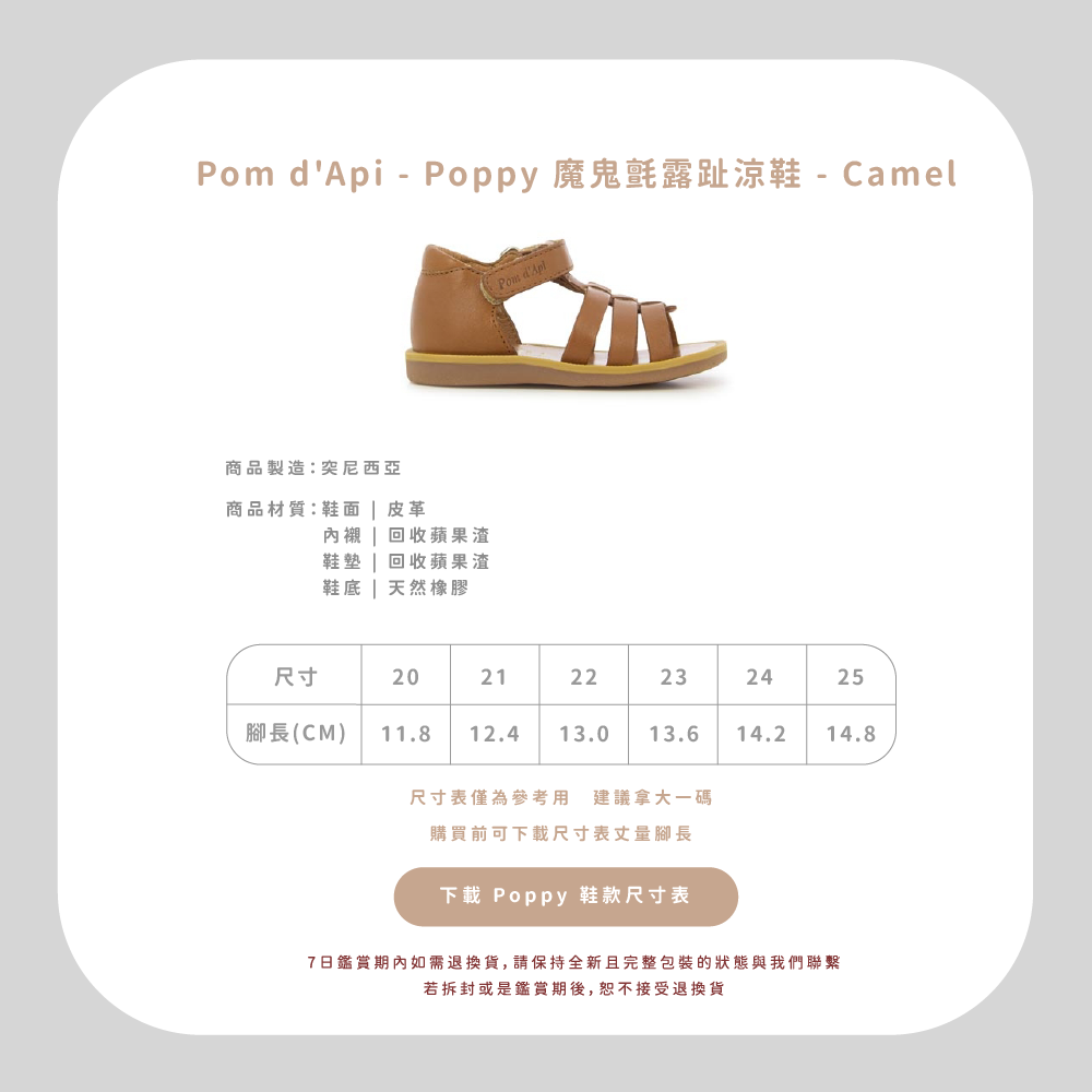 法國足醫專業指定,童鞋界中的愛馬仕精品!專精童鞋領域半個世紀以上的 Pom d’Api,致力成為專業學步鞋的領航者,與 UFSP 足科醫師聯盟合作,推出獨家「第一步鞋」系列,保證每雙鞋都具備科學要求兒童腳步發育的技術標準,支持孩童們邁出人生的第一步。從草圖到完成經過200多個工序,才呈現出細膩完美的質感,同樣重視環保的 Pom d’Api,還開發首創的再生皮革,更加柔軟透氣,也更加友善環境。  以法國著名童謠命名的 Pom d’Api,將法國人的優雅巧思融入精湛鞋藝,打造兼具實用與美感的可愛童鞋。自第一家精品店於1980年在巴黎市中心開業,便以卓越設計在這個時尚之都掀起流行風潮。  針對不同腳型研發的多款鞋型,提供百變的創意造型和經久不變的舒適耐用,在法國百貨歷久不衰的傳奇,穿過的人都知道!