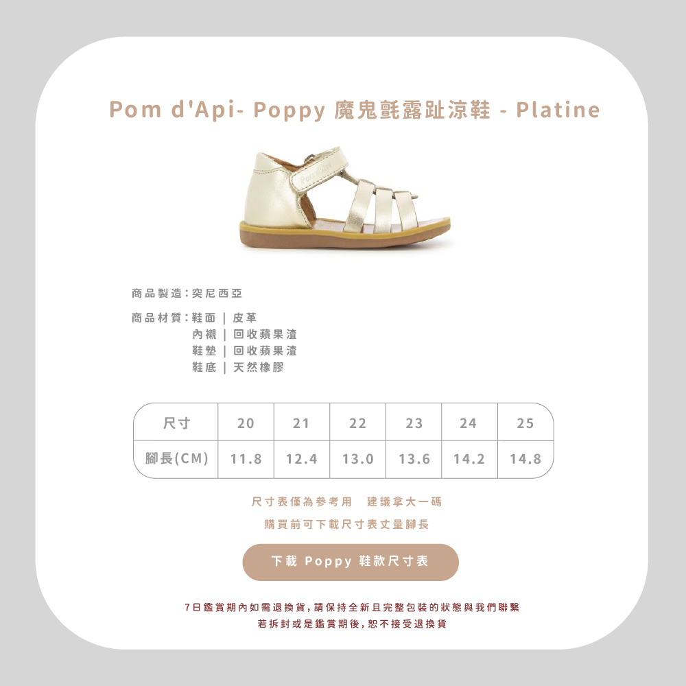 法國足醫專業指定,童鞋界中的愛馬仕精品!專精童鞋領域半個世紀以上的 Pom d’Api,致力成為專業學步鞋的領航者,與 UFSP 足科醫師聯盟合作,推出獨家「第一步鞋」系列,保證每雙鞋都具備科學要求兒童腳步發育的技術標準,支持孩童們邁出人生的第一步。從草圖到完成經過200多個工序,才呈現出細膩完美的質感,同樣重視環保的 Pom d’Api,還開發首創的再生皮革,更加柔軟透氣,也更加友善環境。  以法國著名童謠命名的 Pom d’Api,將法國人的優雅巧思融入精湛鞋藝,打造兼具實用與美感的可愛童鞋。自第一家精品店於1980年在巴黎市中心開業,便以卓越設計在這個時尚之都掀起流行風潮。  針對不同腳型研發的多款鞋型,提供百變的創意造型和經久不變的舒適耐用,在法國百貨歷久不衰的傳奇,穿過的人都知道!