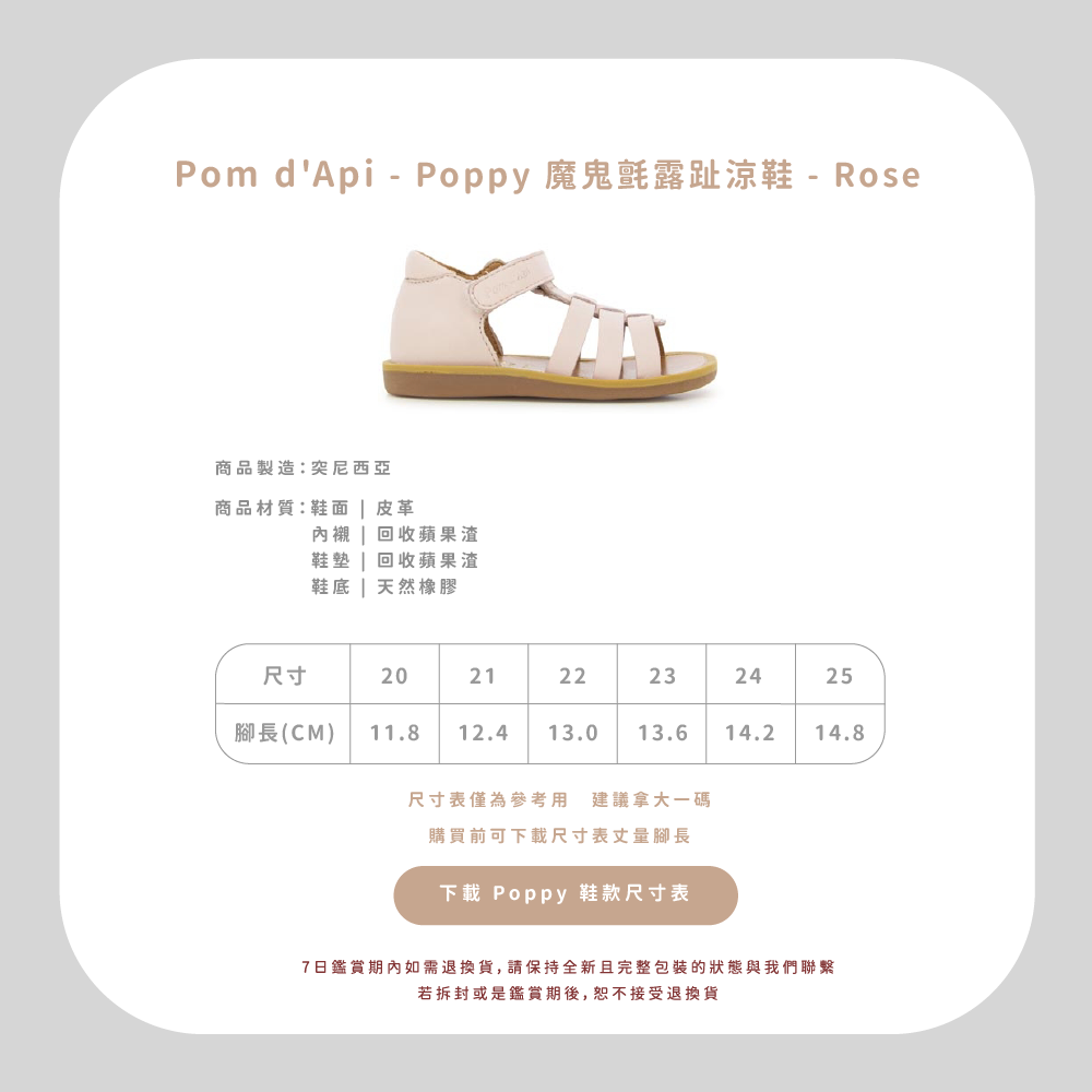 法國足醫專業指定,童鞋界中的愛馬仕精品!專精童鞋領域半個世紀以上的 Pom d’Api,致力成為專業學步鞋的領航者,與 UFSP 足科醫師聯盟合作,推出獨家「第一步鞋」系列,保證每雙鞋都具備科學要求兒童腳步發育的技術標準,支持孩童們邁出人生的第一步。從草圖到完成經過200多個工序,才呈現出細膩完美的質感,同樣重視環保的 Pom d’Api,還開發首創的再生皮革,更加柔軟透氣,也更加友善環境。  以法國著名童謠命名的 Pom d’Api,將法國人的優雅巧思融入精湛鞋藝,打造兼具實用與美感的可愛童鞋。自第一家精品店於1980年在巴黎市中心開業,便以卓越設計在這個時尚之都掀起流行風潮。  針對不同腳型研發的多款鞋型,提供百變的創意造型和經久不變的舒適耐用,在法國百貨歷久不衰的傳奇,穿過的人都知道!