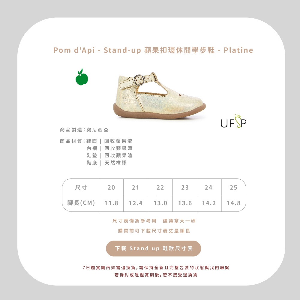 法國足醫專業指定,童鞋界中的愛馬仕精品!專精童鞋領域半個世紀以上的 Pom d’Api,致力成為專業學步鞋的領航者,與 UFSP 足科醫師聯盟合作,推出獨家「第一步鞋」系列,保證每雙鞋都具備科學要求兒童腳步發育的技術標準,支持孩童們邁出人生的第一步。從草圖到完成經過200多個工序,才呈現出細膩完美的質感,同樣重視環保的 Pom d’Api,還開發首創的再生皮革,更加柔軟透氣,也更加友善環境。  以法國著名童謠命名的 Pom d’Api,將法國人的優雅巧思融入精湛鞋藝,打造兼具實用與美感的可愛童鞋。自第一家精品店於1980年在巴黎市中心開業,便以卓越設計在這個時尚之都掀起流行風潮。  針對不同腳型研發的多款鞋型,提供百變的創意造型和經久不變的舒適耐用,在法國百貨歷久不衰的傳奇,穿過的人都知道!