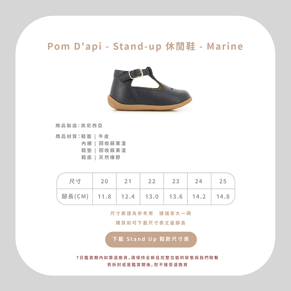 法國足醫專業指定,童鞋界中的愛馬仕精品!專精童鞋領域半個世紀以上的 Pom d’Api,致力成為專業學步鞋的領航者,與 UFSP 足科醫師聯盟合作,推出獨家「第一步鞋」系列,保證每雙鞋都具備科學要求兒童腳步發育的技術標準,支持孩童們邁出人生的第一步。從草圖到完成經過200多個工序,才呈現出細膩完美的質感,同樣重視環保的 Pom d’Api,還開發首創的再生皮革,更加柔軟透氣,也更加友善環境。  以法國著名童謠命名的 Pom d’Api,將法國人的優雅巧思融入精湛鞋藝,打造兼具實用與美感的可愛童鞋。自第一家精品店於1980年在巴黎市中心開業,便以卓越設計在這個時尚之都掀起流行風潮。  針對不同腳型研發的多款鞋型,提供百變的創意造型和經久不變的舒適耐用,在法國百貨歷久不衰的傳奇,穿過的人都知道!