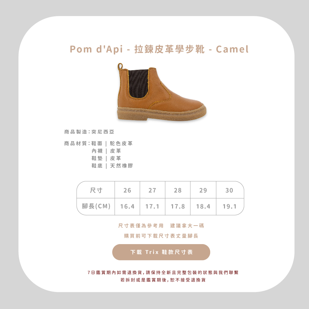 法國足醫專業指定,童鞋界中的愛馬仕精品!專精童鞋領域半個世紀以上的 Pom d’Api,致力成為專業學步鞋的領航者,與 UFSP 足科醫師聯盟合作,推出獨家「第一步鞋」系列,保證每雙鞋都具備科學要求兒童腳步發育的技術標準,支持孩童們邁出人生的第一步。從草圖到完成經過200多個工序,才呈現出細膩完美的質感,同樣重視環保的 Pom d’Api,還開發首創的再生皮革,更加柔軟透氣,也更加友善環境。  以法國著名童謠命名的 Pom d’Api,將法國人的優雅巧思融入精湛鞋藝,打造兼具實用與美感的可愛童鞋。自第一家精品店於1980年在巴黎市中心開業,便以卓越設計在這個時尚之都掀起流行風潮。  針對不同腳型研發的多款鞋型,提供百變的創意造型和經久不變的舒適耐用,在法國百貨歷久不衰的傳奇,穿過的人都知道!