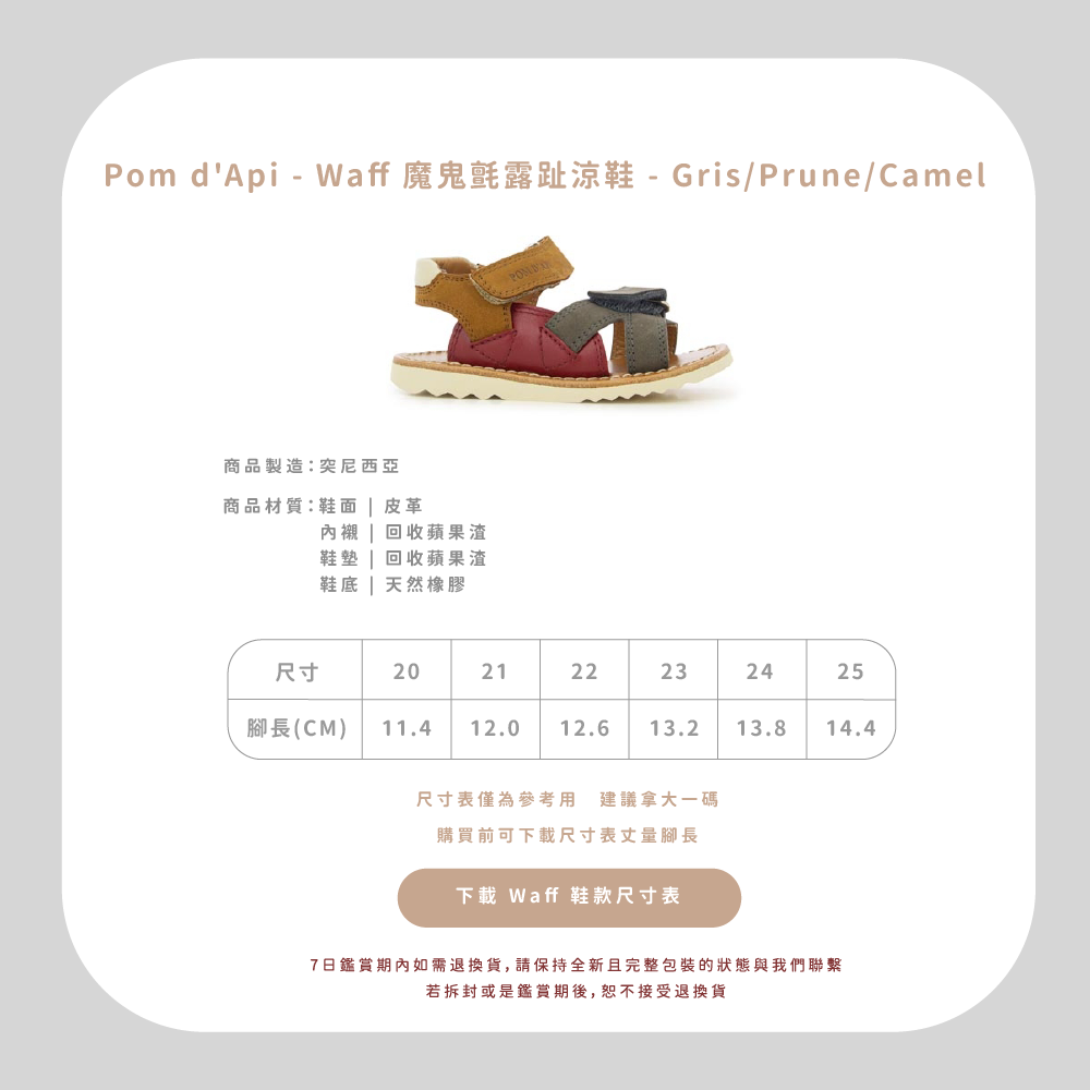 法國足醫專業指定,童鞋界中的愛馬仕精品!專精童鞋領域半個世紀以上的 Pom d’Api,致力成為專業學步鞋的領航者,與 UFSP 足科醫師聯盟合作,推出獨家「第一步鞋」系列,保證每雙鞋都具備科學要求兒童腳步發育的技術標準,支持孩童們邁出人生的第一步。從草圖到完成經過200多個工序,才呈現出細膩完美的質感,同樣重視環保的 Pom d’Api,還開發首創的再生皮革,更加柔軟透氣,也更加友善環境。  以法國著名童謠命名的 Pom d’Api,將法國人的優雅巧思融入精湛鞋藝,打造兼具實用與美感的可愛童鞋。自第一家精品店於1980年在巴黎市中心開業,便以卓越設計在這個時尚之都掀起流行風潮。  針對不同腳型研發的多款鞋型,提供百變的創意造型和經久不變的舒適耐用,在法國百貨歷久不衰的傳奇,穿過的人都知道!