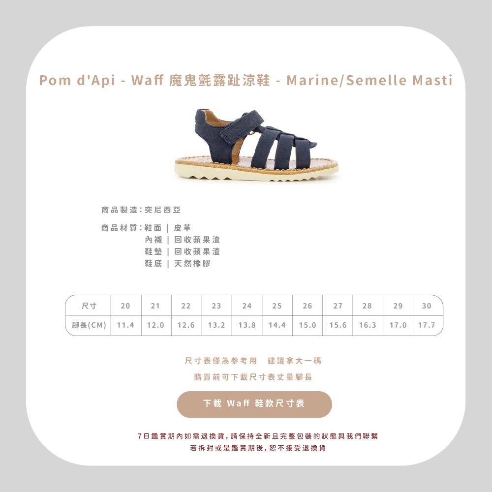 法國足醫專業指定,童鞋界中的愛馬仕精品!專精童鞋領域半個世紀以上的 Pom d’Api,致力成為專業學步鞋的領航者,與 UFSP 足科醫師聯盟合作,推出獨家「第一步鞋」系列,保證每雙鞋都具備科學要求兒童腳步發育的技術標準,支持孩童們邁出人生的第一步。從草圖到完成經過200多個工序,才呈現出細膩完美的質感,同樣重視環保的 Pom d’Api,還開發首創的再生皮革,更加柔軟透氣,也更加友善環境。  以法國著名童謠命名的 Pom d’Api,將法國人的優雅巧思融入精湛鞋藝,打造兼具實用與美感的可愛童鞋。自第一家精品店於1980年在巴黎市中心開業,便以卓越設計在這個時尚之都掀起流行風潮。  針對不同腳型研發的多款鞋型,提供百變的創意造型和經久不變的舒適耐用,在法國百貨歷久不衰的傳奇,穿過的人都知道!