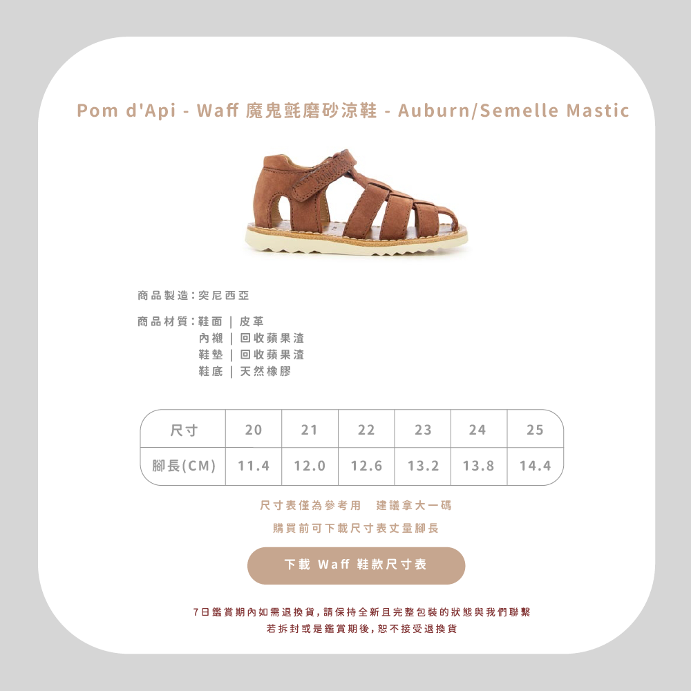 法國足醫專業指定,童鞋界中的愛馬仕精品!專精童鞋領域半個世紀以上的 Pom d’Api,致力成為專業學步鞋的領航者,與 UFSP 足科醫師聯盟合作,推出獨家「第一步鞋」系列,保證每雙鞋都具備科學要求兒童腳步發育的技術標準,支持孩童們邁出人生的第一步。從草圖到完成經過200多個工序,才呈現出細膩完美的質感,同樣重視環保的 Pom d’Api,還開發首創的再生皮革,更加柔軟透氣,也更加友善環境。  以法國著名童謠命名的 Pom d’Api,將法國人的優雅巧思融入精湛鞋藝,打造兼具實用與美感的可愛童鞋。自第一家精品店於1980年在巴黎市中心開業,便以卓越設計在這個時尚之都掀起流行風潮。  針對不同腳型研發的多款鞋型,提供百變的創意造型和經久不變的舒適耐用,在法國百貨歷久不衰的傳奇,穿過的人都知道!