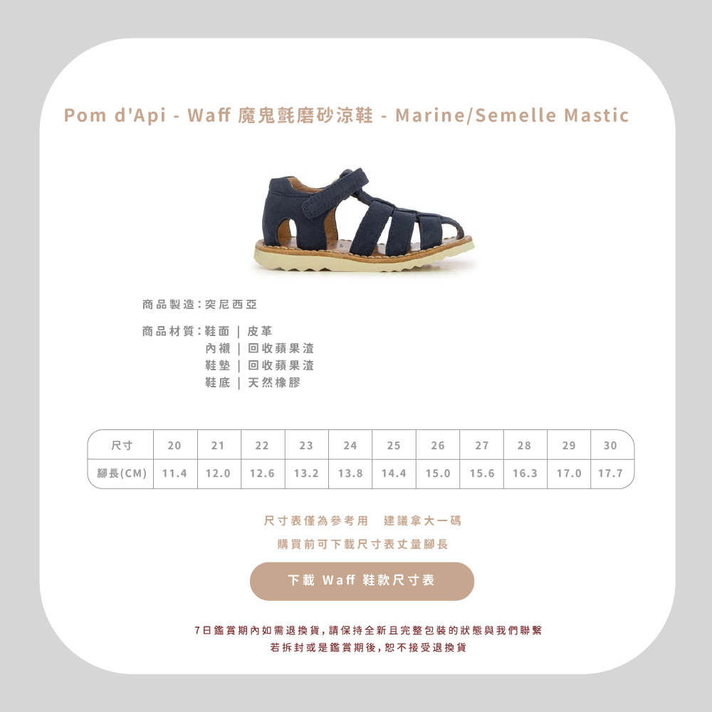 法國足醫專業指定,童鞋界中的愛馬仕精品!專精童鞋領域半個世紀以上的 Pom d’Api,致力成為專業學步鞋的領航者,與 UFSP 足科醫師聯盟合作,推出獨家「第一步鞋」系列,保證每雙鞋都具備科學要求兒童腳步發育的技術標準,支持孩童們邁出人生的第一步。從草圖到完成經過200多個工序,才呈現出細膩完美的質感,同樣重視環保的 Pom d’Api,還開發首創的再生皮革,更加柔軟透氣,也更加友善環境。  以法國著名童謠命名的 Pom d’Api,將法國人的優雅巧思融入精湛鞋藝,打造兼具實用與美感的可愛童鞋。自第一家精品店於1980年在巴黎市中心開業,便以卓越設計在這個時尚之都掀起流行風潮。  針對不同腳型研發的多款鞋型,提供百變的創意造型和經久不變的舒適耐用,在法國百貨歷久不衰的傳奇,穿過的人都知道!