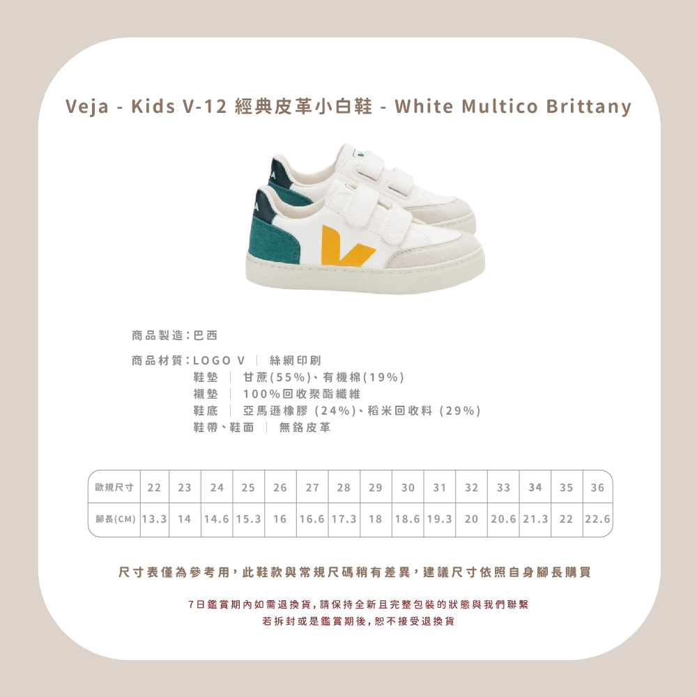 Veja - Kids V-12 經典皮革小白鞋 - White Multico Brittany